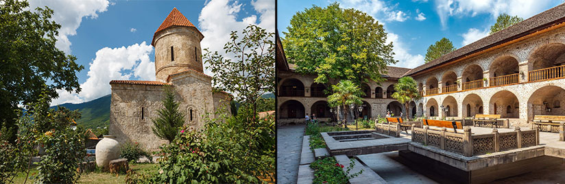 Aziz Elisée'nin himayesinde inşa edilmiştir. Ekstra bir küçük transept ve yarım eliptik bir platform içine yerleştirilmiş bir sunak ile kilise oldukça özgün bir yapıdır. Müzeye dönüştürülmüş olsa da, hâlâ maneviyata düşkün Azeriler için bir hac yeridir. Öğle yemeğinden sonra, Kafkas Dağları'nın eteklerinde kurulu olan ve bu sayede yazın serinlik sağlayan Şeki şehrine geri dönüş. Kuruluşu çok eskilere dayanan bu şehir, XVI. yüzyıldan itibaren İpek Yolu ve değerli tekstil üretimi sayesinde gelişmiştir. XVIII. yüzyılda şehirde beş büyük kervansaray ve yüz bin nüfus bulunmaktaydı; bu kervansaraylar şehrin dinamizminin ve refahının sembolüydü. XIX. yüzyılda Sheki, Ruslar tarafından kullanılan önemli bir kale haline geldi. Bağımsızlıktan sonra şehir, kendine bir yön arayışına girmiş ve turizme yönelmiştir. Eski Şehir, iyi korunmuş XVIII. yüzyıl surları ile çevrilidir ve en ilginç mekanları barındırır.