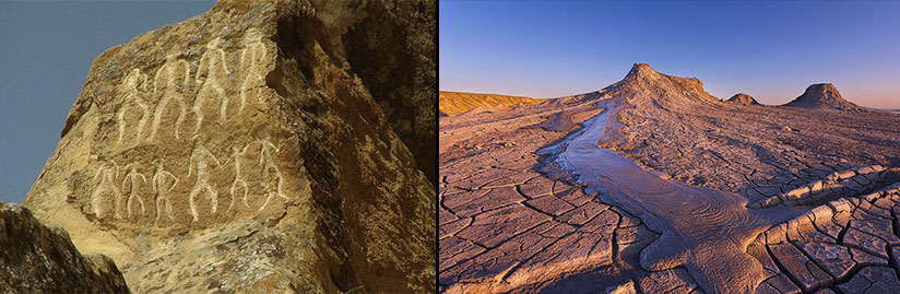 Gobustan'a varış. Gobustan, 1920 yılında bir kuyu kazısı esnasında ortaya çıkarılan arkeolojik alanıyla tanınır. Düz bir çölden yükselen olağanüstü bir dağ, bu alanın çerçevesini oluşturur. Dağ birçok kaya resmi barındırır, bu eserler eski dönem halkının günlük yaşamını ve dini ritüellerini yansıtır. Birbirine tünellerle bağlı yirmi bir kaya sığınağından, özellikle